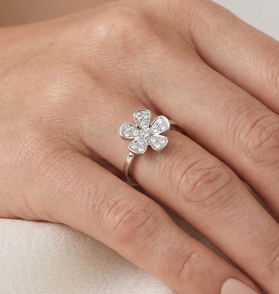 Anillo Rafael Torres Flor en oro blanco 3.74g y brillantes 0.27ct, color F-G, pureza VS1
