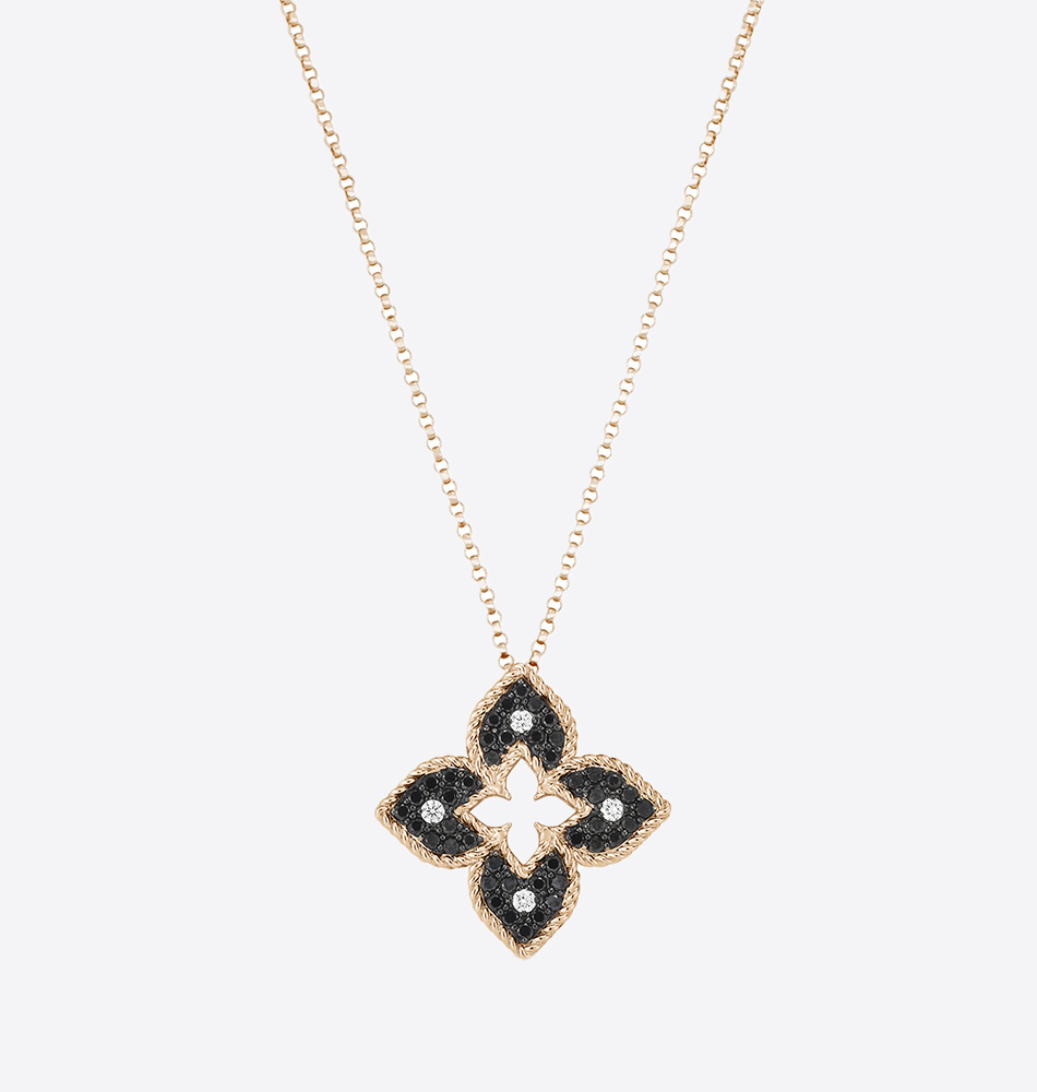 Collar Roberto Coin colección Venetian Princess con diamantes (0.1148 ct), diamantes negros (0.3124ct) y un rubí (0.0174 ct) en oro rosa y blanco. Peso oro: 5 g