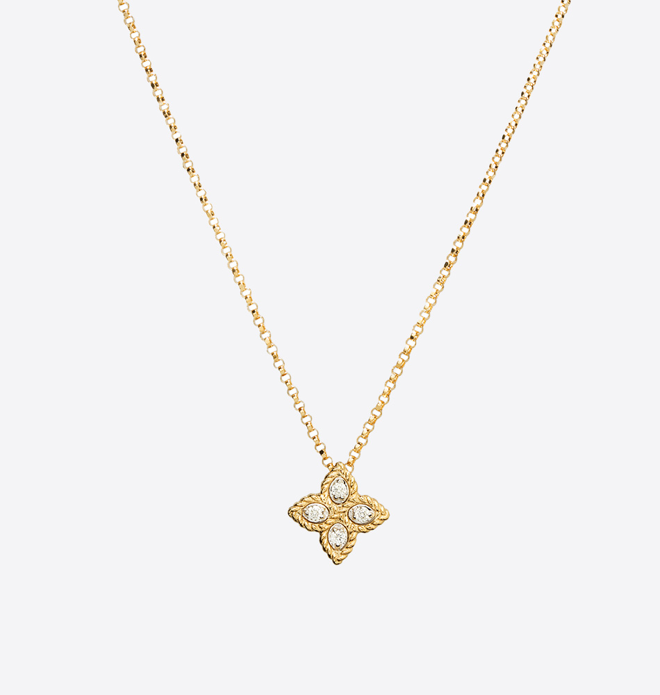 Availability: DisponibleCollar Roberto Coin Princess Flower con diamantes (0.046ct) y un rubí (0.0174ct) en oro amarillo y blanco. Peso oro: 3.40g. Medida: 45cm