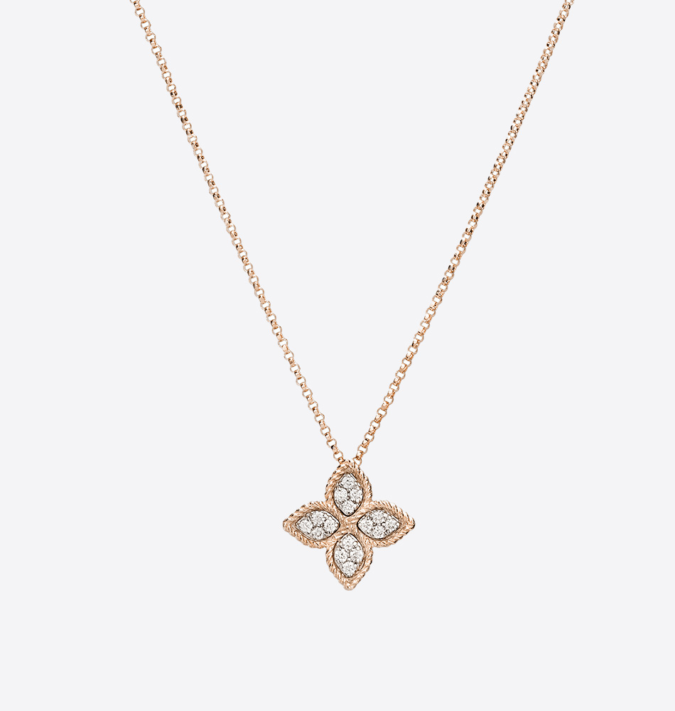 Collar Roberto Coin colección Princess Flower en oro rosa y blanco con diamantes (0.1848ct) y un rubí (0.174ct) . Peso oro: 4.20g. Medida: 45cm.