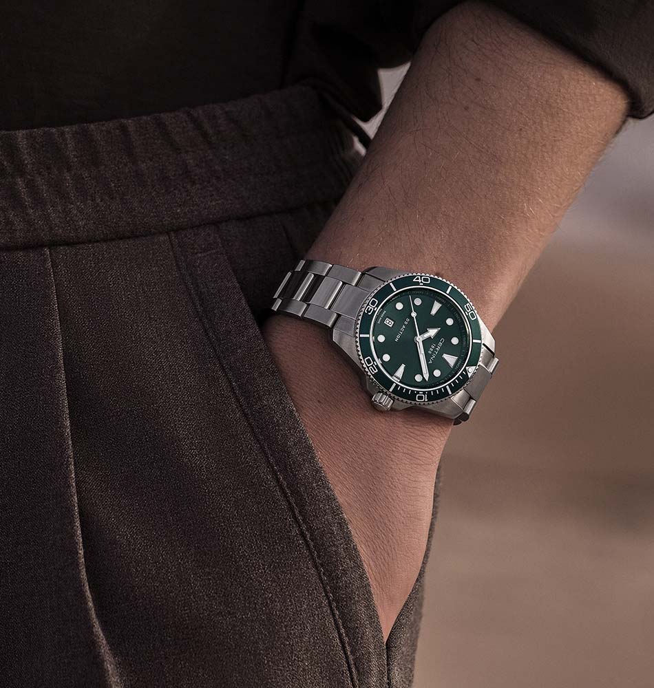 El Certina DS Action 40 mm Cuarzo Verde C048.410.11.091.00 combina el inconfundible estilo deportivo suizo con una elegancia contemporánea inspirada en los tonos del océano. Su esfera verde intensa y su bisel de aluminio aportan frescura y dinamismo, mientras que la caja de acero inoxidable 316L garantiza resistencia, durabilidad y un brillo impecable.