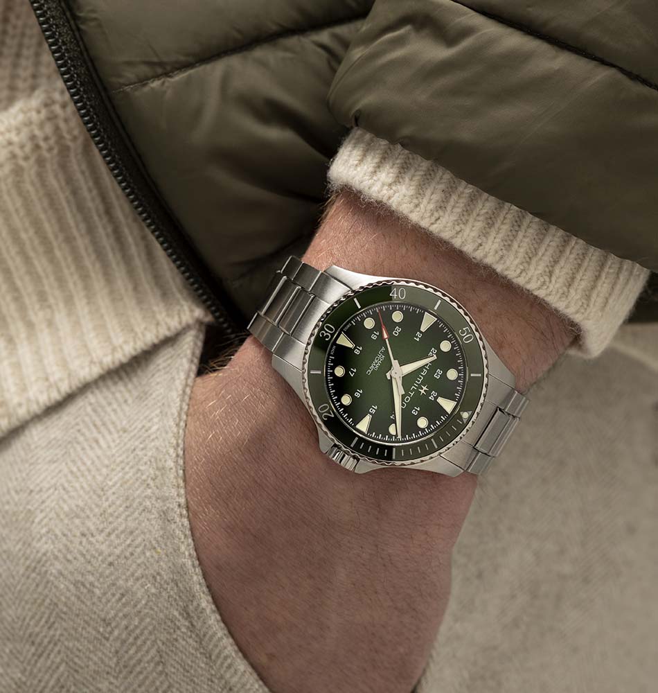 El Hamilton Khaki Navy Scuba Auto 43 mm H82525160 es un reloj deportivo que combina diseño robusto y funcionalidad avanzada, ideal tanto para aventuras acuáticas como para el día a día. Su bisel de cerámica verde intenso y la esfera degradada en tonos verdes, que van del oscuro al verde bosque, aportan profundidad y carácter a una estética moderna y atractiva.