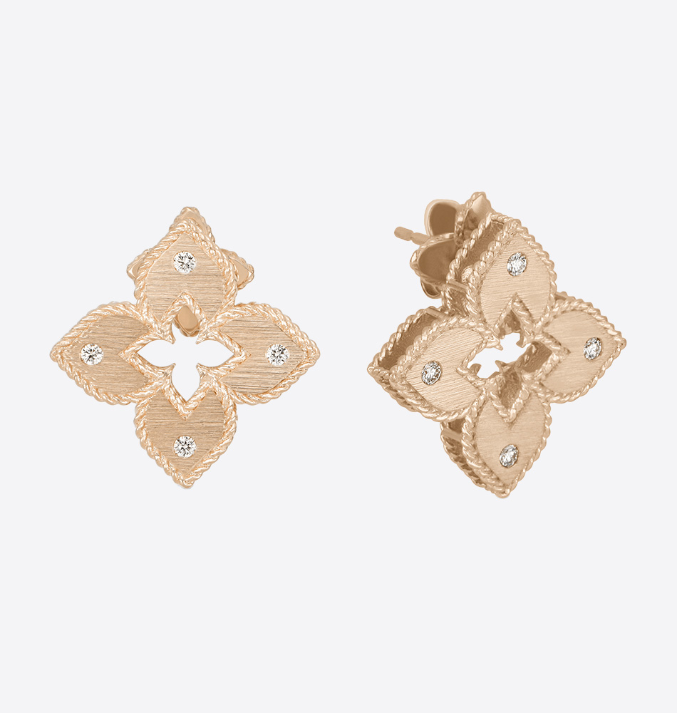 Availability: DisponiblePendientes Roberto Coin colección Venetian Princess con diamantes (0.1148 ct) y dos rubies (0.0348 ct) en oro rosa. Peso oro: 6.80g.