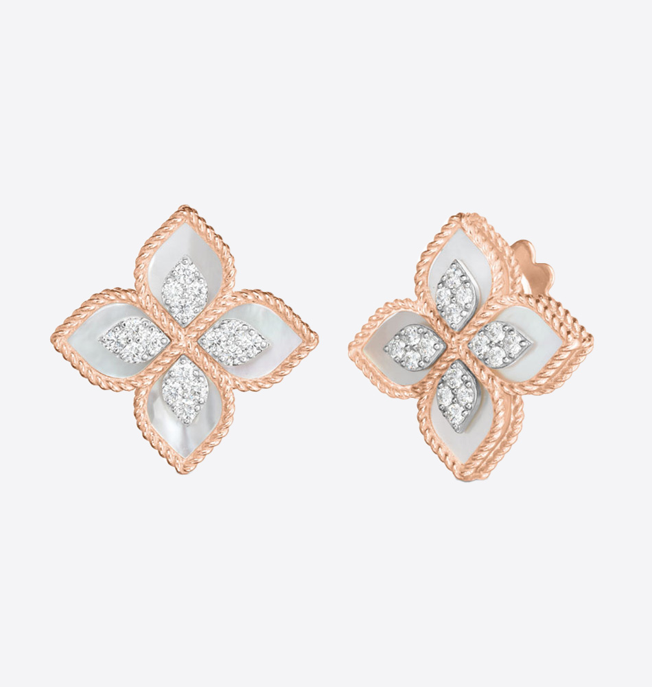 Pendientes Roberto Coin colección Princess Flower con diamantes (0.3696 ct), madreperla (6.8000 ct) y dos rubies (0.0104 ct) en oro rosa y blanco. Peso oro: 6.10 g.
