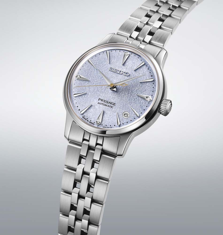 Su caja de acero inoxidable de 34 mm, con un perfil delgado de solo 10,7 mm, ofrece comodidad en la muñeca. Asimismo, el cristal Hardlex en forma de caja asegura durabilidad y elegancia. La esfera azul clara, decorada con diamantes, brinda un brillo sutil que realza la sofisticación del modelo. Así, el SRPL61J1 se convierte en una pieza delicada y refinada.
