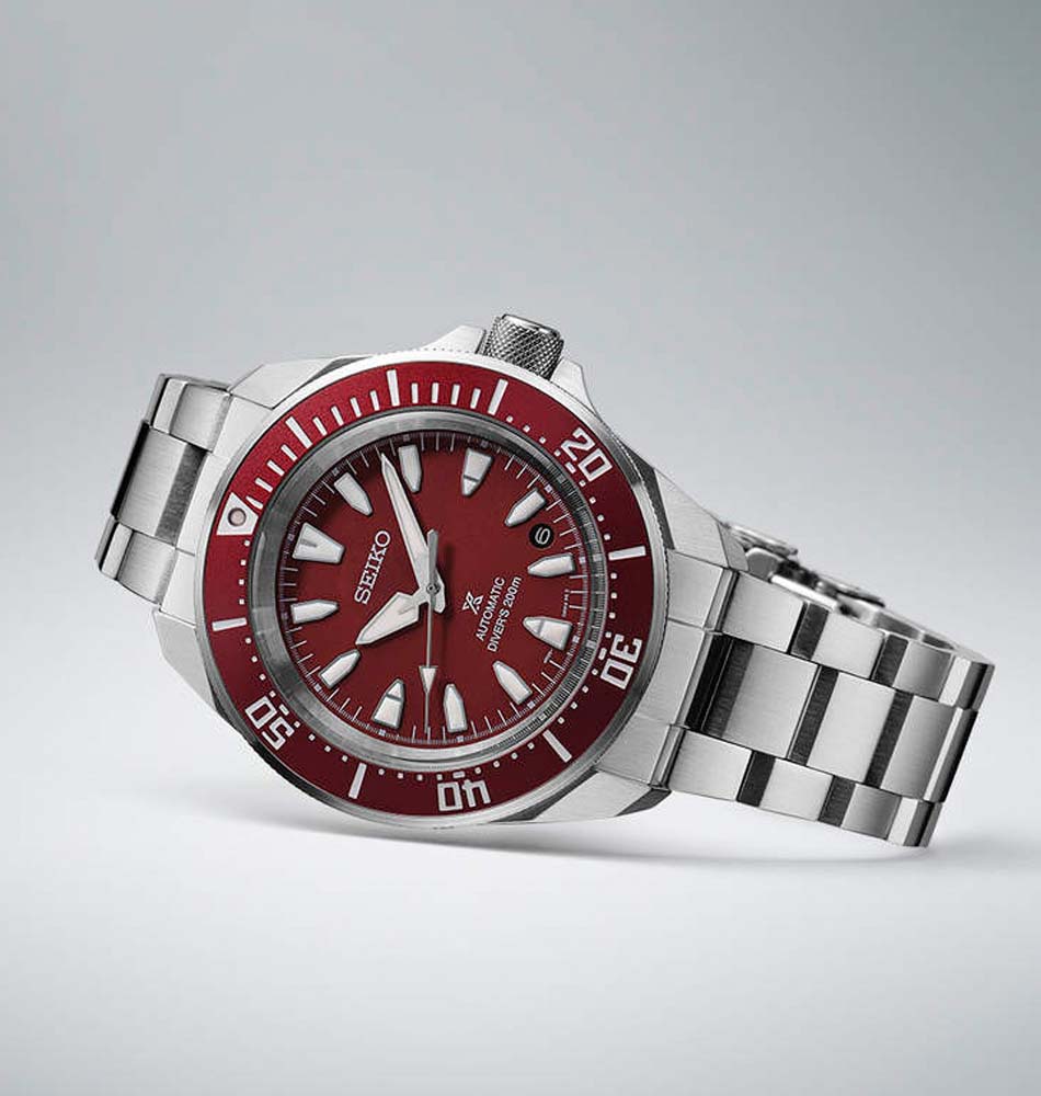 El Seiko Prospex Mar Samurai Rojo SRPL11K1 es un reloj automático que destaca por su diseño audaz y deportivo. Su caja de 41,7 mm en acero inoxidable está acompañada de un bisel giratorio unidireccional totalmente rojo, lo que refuerza su carácter de diver profesional.